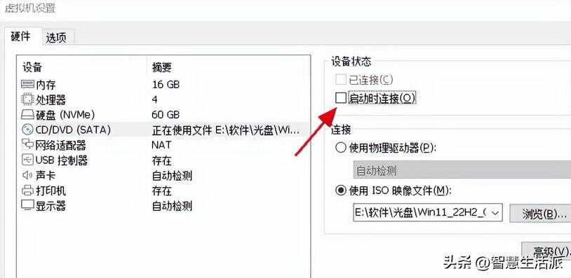 安装完操作系统或相应软件后,如果以后不需要用到光驱的话,可以移除或者取消勾选“启动时连接”,这样就相当与虚拟机没有光驱了,启动的时候也就不检测光驱,加快启动速度。