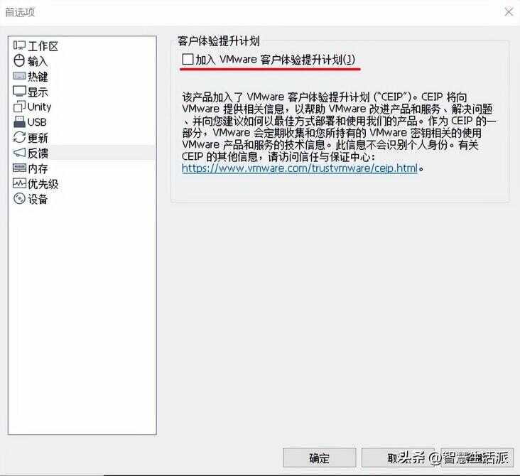 4、选择VMware菜单:编辑–>首选项–>反馈,取消勾选”加入VMware客户体验提升计划“