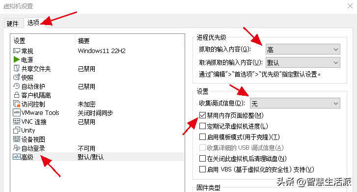将“抓取的输入内容”,设为高、将“收集调试信息”设为无、勾选“禁用内存页面休整”(提示:如果勾选这个导致系统异常,则取消勾选)