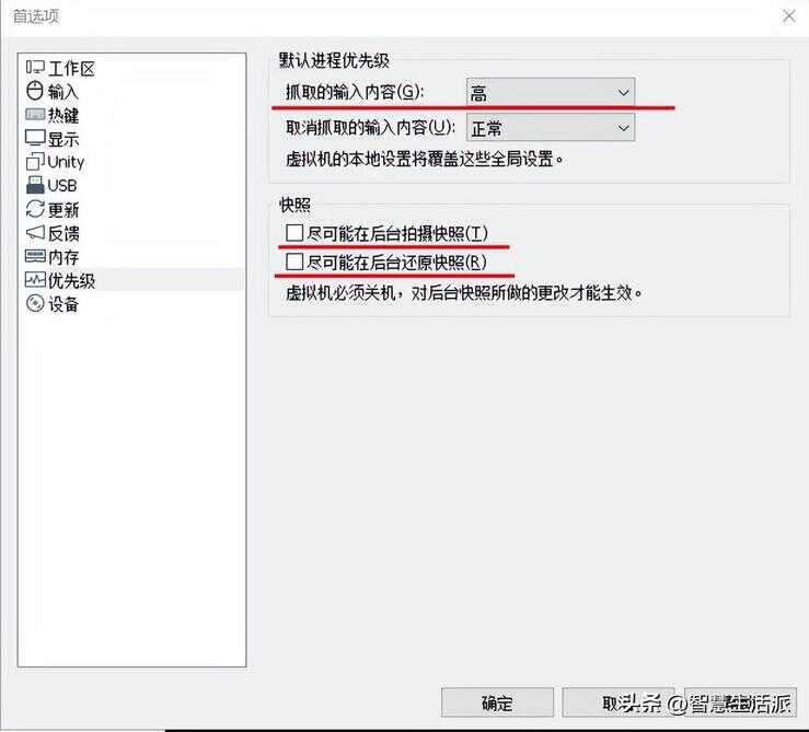 2、选择VMware菜单:编辑–>首选项–>优先级,默认进程优先级列表项,将抓取的输入内容设置为“高”,同时取消勾选”尽可能在后台拍摄快照“ 和” 尽可能在后台还原快照“