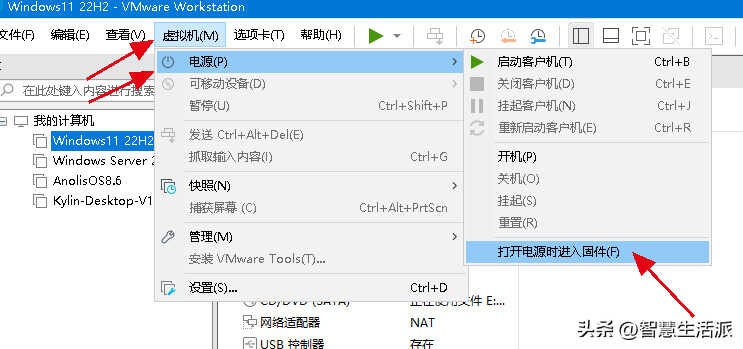 首先说1下怎么进入虚拟机的BIOS/UEFI设置界面。想进入虚拟机的BIOS可不是在启动的时候按DEL键,而是通过菜单选择进入虚拟机,如图: