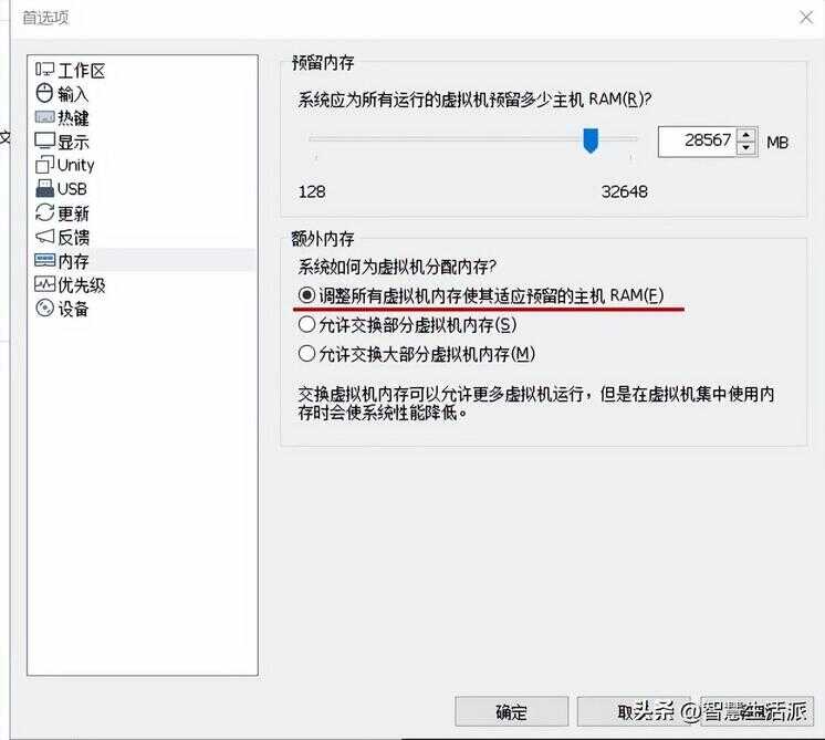 1、选择VMware菜单:编辑–>首选项–>内存,选取第一项“调整所有虚拟机内存使其适应预留的主机RAM(F)”。