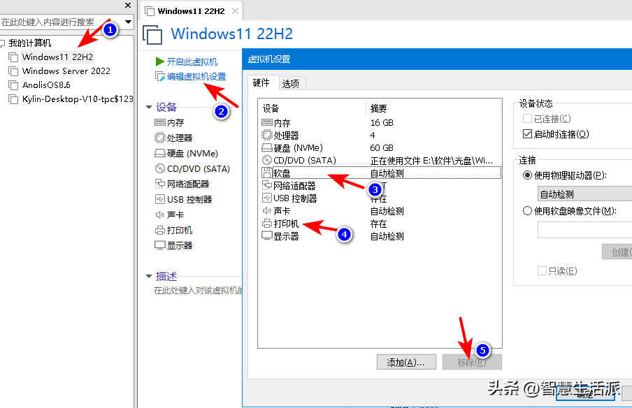 1、 选择虚拟机:编辑虚拟机设置–>硬件,移除用不到的设备