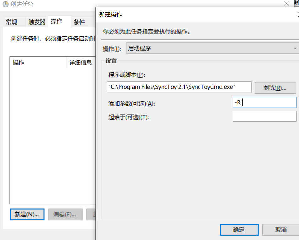 新建一个启动 SyncToy 的操作,具体配置如图。-R 必填,-R 后面也可以跟上需要同步的文件夹,比如前面创建的“公司文件”文件夹,可以写成 -R 公司文件,这样就只会同步公司文件一个文件夹了。