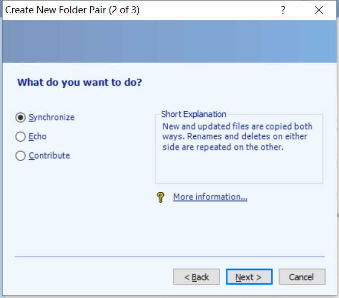 - Synchronize,该模式会让两个文件夹保持完全同步,无论左右增删修改都会同步到另一边;
