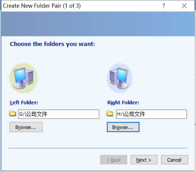 然后分别配置左文件路径和右文件路径,这里你可以理解为 Left Folder 为你电脑上的文件,Right Folder 你同事电脑上的文件,实际就是两个互为同步的端。这里我就在本机两个不同盘符做测试了实际操作中,可以根据你同事共享的文件地址填写进去。