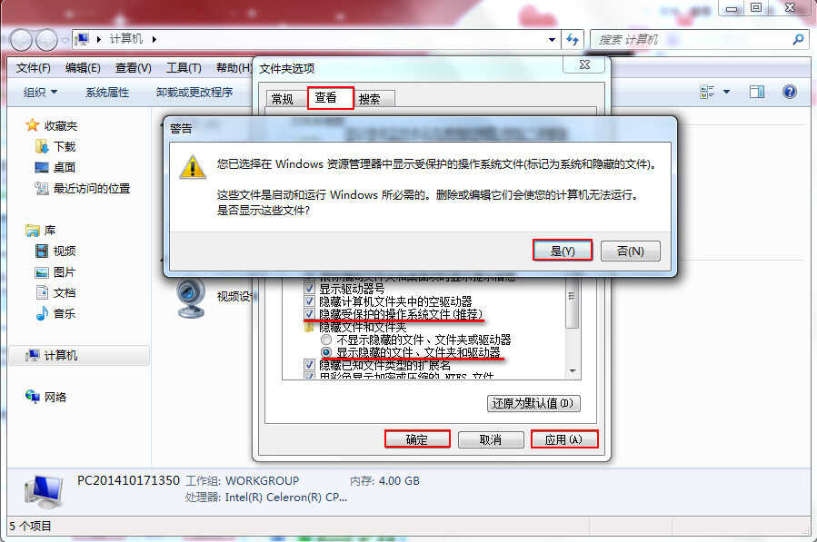 2、点击“查看”页面,将高级设置中“隐藏受保护的操作系统文件(推荐)”前面的勾选去掉,直接点击“确认”,点击“显示隐藏的文件、文件夹和驱动器”,点击“应用--确定”,如下图所示: