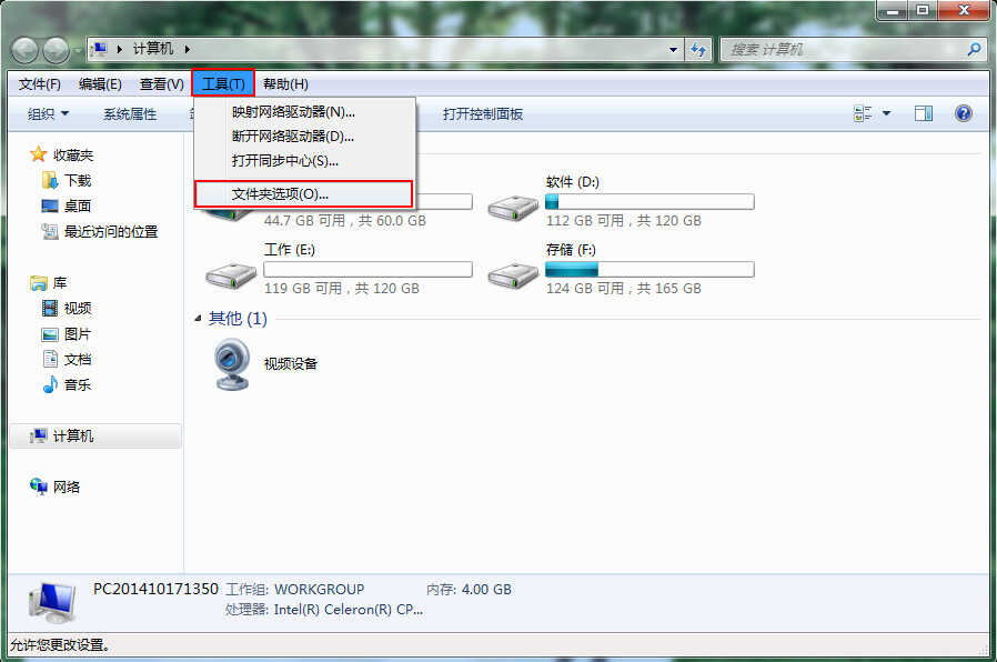 1、双击桌面“计算机”图标,选择“工具--文件夹选项”,如下图所示: