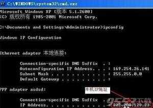 IP地址是使用ADSL拨号上网时,由电信服务提供商分配给你的IP地址,通常这种地址称之为"动态地址",也就是说电脑每次开机都将分配给你新的IP地址,那么如何查看本机IP呢? 首先,打开"开始"菜单--选择"运行"--输入"cmd"--按下"Enter"回车键,这样做可以打开"命令提示符",在命令提示符中输入"ipconfig",按下"Enter"回车键。