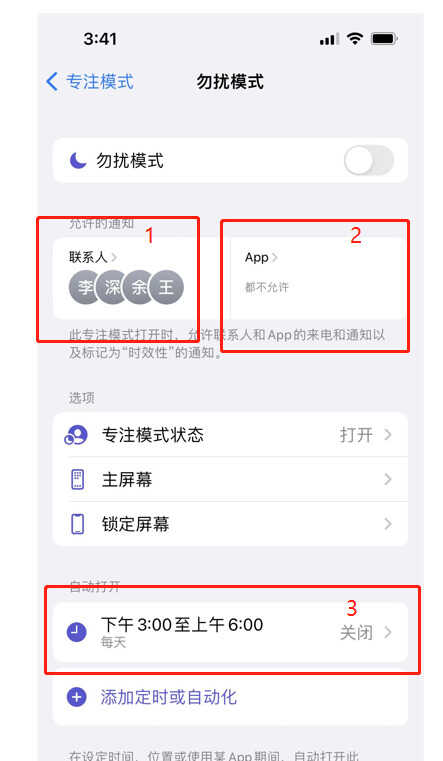 第四步:这是最关键的一步,上面的步骤都是必要的铺垫。1区域我们可以设置在勿扰模式下那些重要人物可以打进来电话,2区域我们可以设置勿扰状态下那些app可以继续通知,3区域设置勿扰模式自动打开的时间(我一般习惯于手动打开,设置的自动时间是凌晨三点到早上六点),大家在设置时间的时候注意上午和下午的切换,避免设置成白天打开勿扰模式。