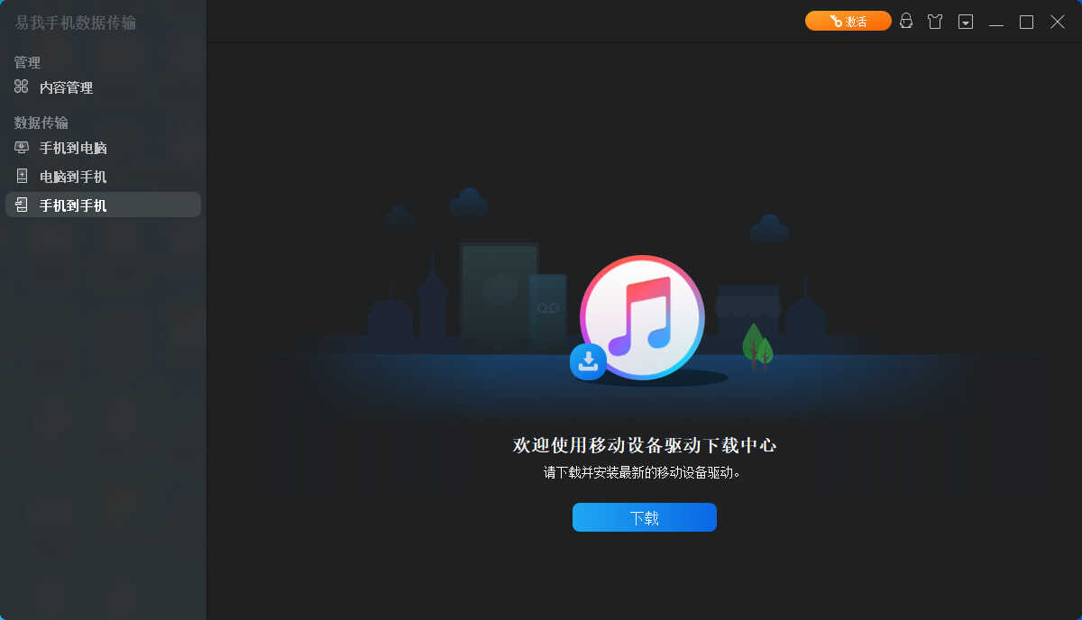 启动易我手机数据传输并找到「手机到手机」模式,进入“欢迎使用移动设备驱动下载中心”,点击「下载」。