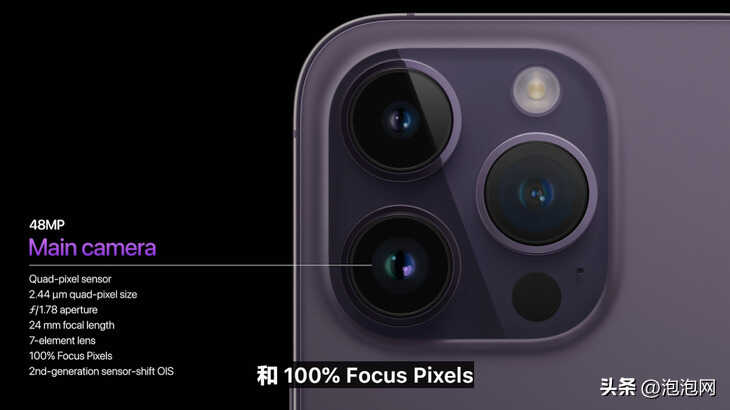 iPhone 14 Pro系列的主摄还配备有100%的Focus Pixels(像素对焦能力),配备有全新的第二代传感器位移式光学防抖,采用24mm焦距,苹果官方称,其可以进行2X的裁切,获得44mm焦距的拍摄效果。