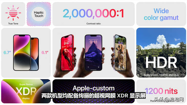 iPhone 14和iPhone 14 Plus在屏幕方面依然采用了超瓷晶面板,最高亮度可达1200nit,整体看起来亮度参数和iPhone 13 Pro非常类似。在屏幕大小方面,iPhone 14采用的是6.1英寸的屏幕,而iPhone 14 Plus采用的是6.7英寸的屏幕大小。
