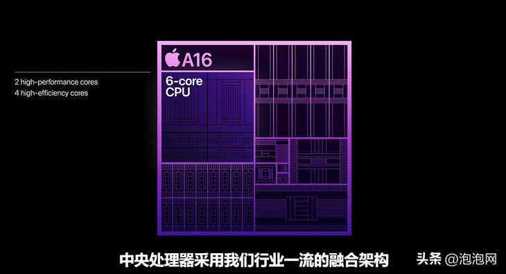 iPhone 14 Pro采用了全新A16仿生芯片,全新的A16仿生芯片采用了4nm工艺进行制造,拥有160亿个晶体管。采用6 CPU+5 GPU的核心配置。在其中的CPU方面,其配置为2性能核心和4能效核心的配置。苹果官方的数据指出,A16芯片的能效核心相比较于A15芯片拥有20%的能效提升。而A16芯片全新的GPU相比较于A15芯片则拥有高达50%的带宽提升。
