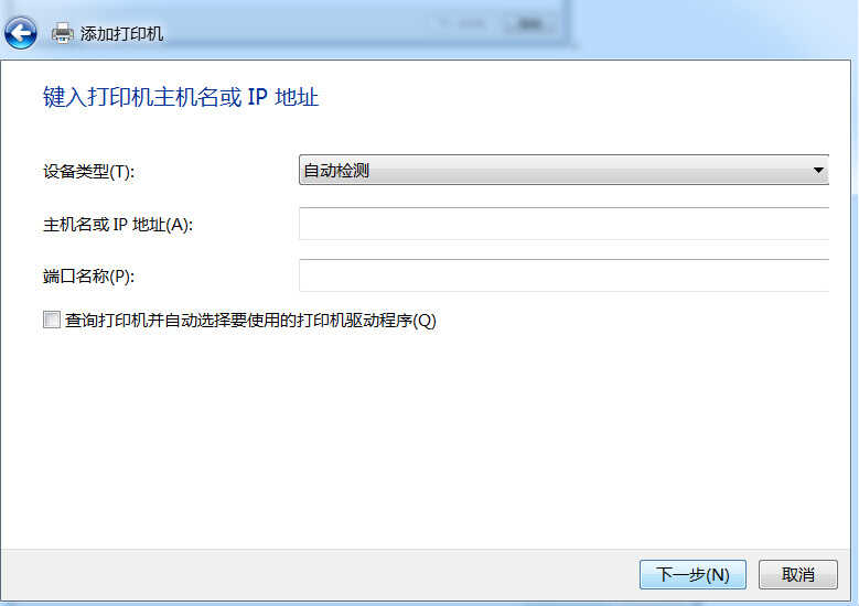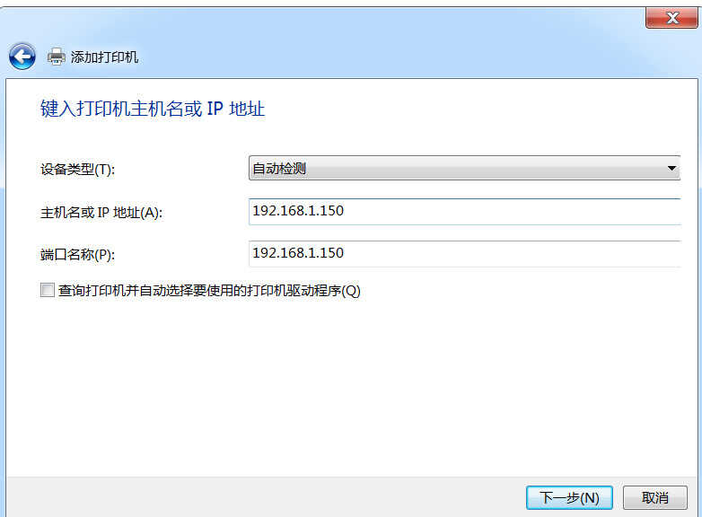 7.输入打印机的IP地址,如:192.168.1.150。如果你不知道,你可到打印机上的显示屏上去看,就显示在上面,当然有的是不显示的,你可以按“菜单”或“功能”键,按向下键找到“网络”,按“确定(OK)”键,再向下键,找到IP地址,按“确定(OK)”键。看到后记住,最后按返回键退出来。