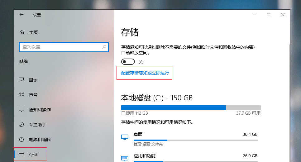 在系统界面左侧找到【存储】选项,然后在右边找到【配置存储感知或立即运行】。