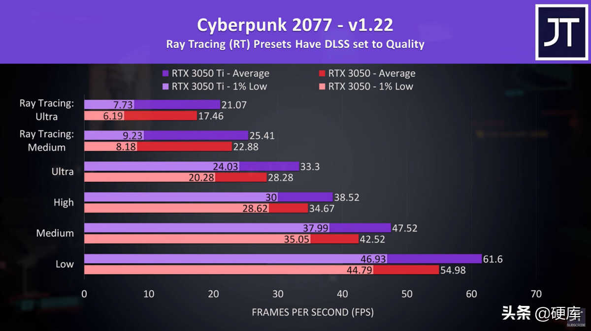 在赛博朋克2077 1080p高特效不开启光追设置下,3050ti的帧数为38.52,3050的帧数则有34.67帧,3050ti高了11.1%。提升不大,游戏的提升也比较有限。