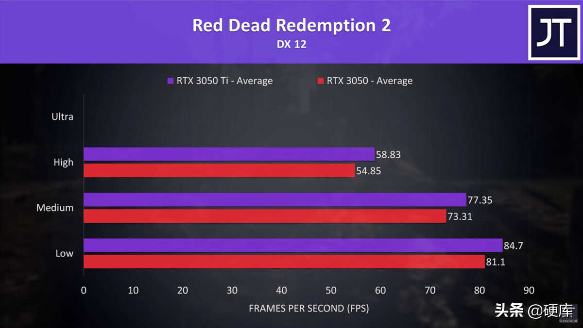 在荒野大镖客2中,1080p中特效下,3050ti也仅仅高了4帧,5.4%。这样的性能表现差距可以说完全是同水平的级别。