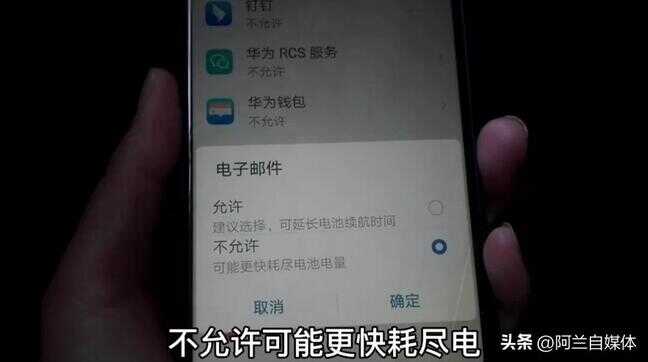 比如我们把电子邮件点开,注意看下方,“不允许”可能更快耗尽电池电量,这是手机默认的状态,“允许”建议选择,可延长电池续航时间。我们把“允许”后边的按钮点一下变成蓝色,然后再点下方的“确认”,那样就会大大地减少手机电量的消耗。同样的方法,我们把下面应用的也更改成“允许”,然后再点“确定”,这样就会节省手机的电量。我是以华为手机为大家做的演示的,你学会了吗?