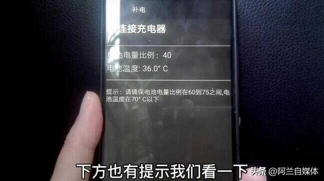 注意看下方有一个“补电”,我们把补电打开,下方也有提示,我们看一下,请确保手机电量比例在60到75之间,电池温度在70度以下,而我现在的电池温度是36度,是符合条件的!但是我的手机电量比例是40,要确保手机的电量比例在60到75之间,我们赶快去充电吧!