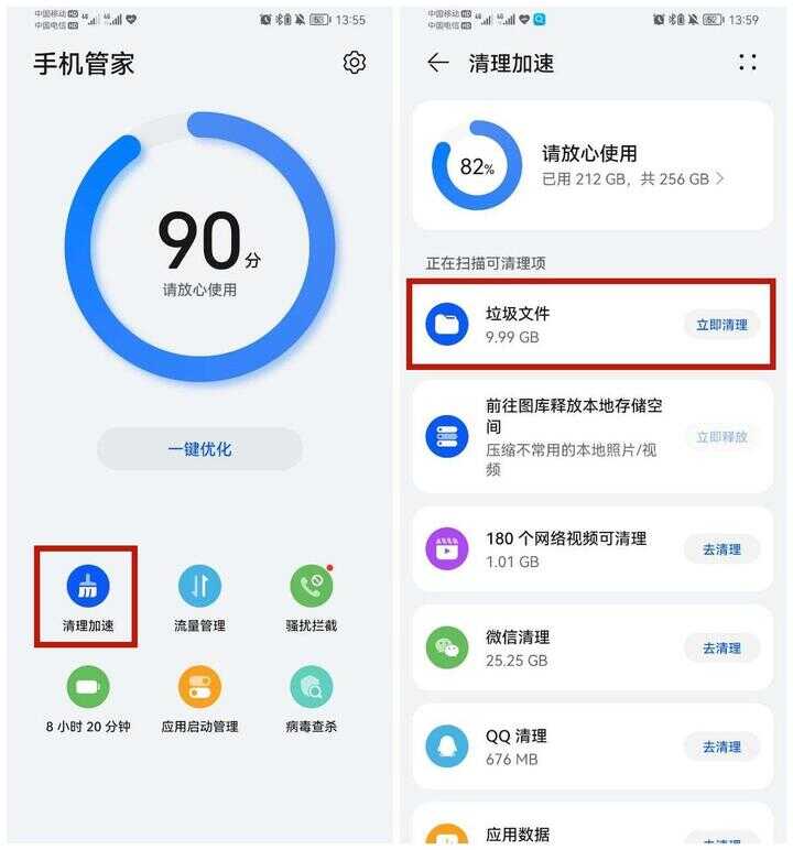 【操作方法】:手机管家——“清理加速”——等待系统扫描可清理项之后,点击“立即清理”。