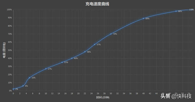 从充电速度来看,vivo S12采用了常见的涓流充电保护技术,在前10分钟充电速度飞快,轻易就达到了30%电量,之后基本保持着1分钟2~3%电量的提升速度,但到了90%之后充电速度骤降,1分钟甚至是2分钟只能为电池充电1%,在55分钟时电量充满。