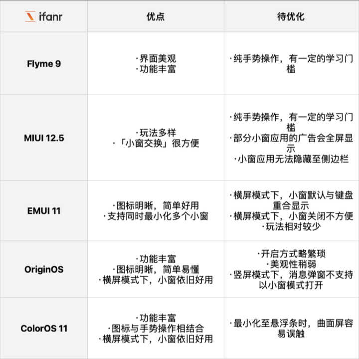 从上手体验来看,上述五大操作系统的小窗模式各有特色。论美观,Flyme 做得更好;论简单易操作,EMUI 当仁不让;论玩法的多样性,ColorOS、MIUI、OriginOS 必须拥有姓名。