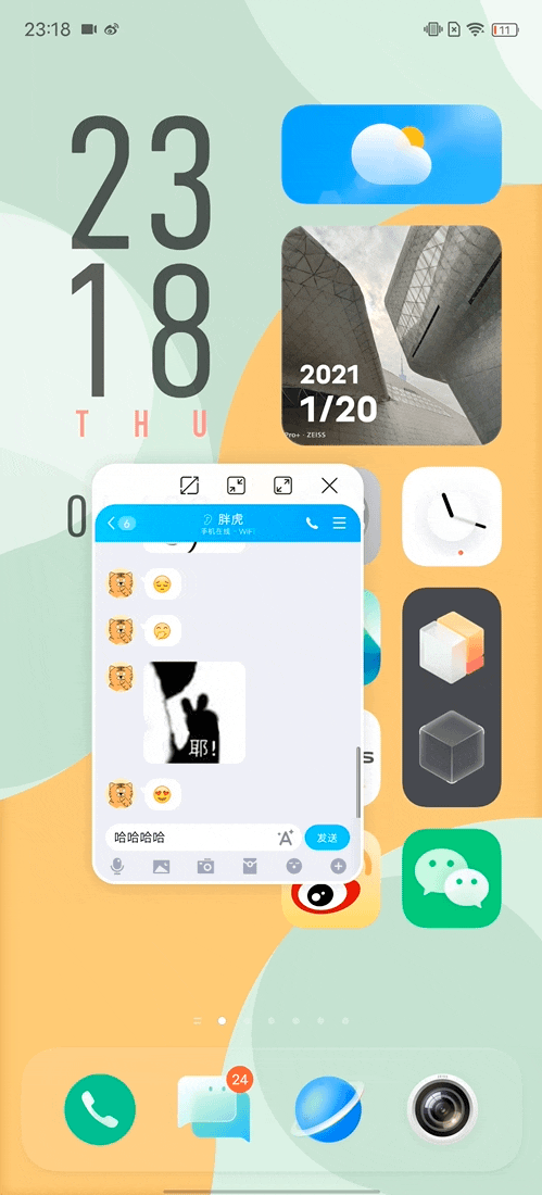只需要将微信 app 的窗口缩小,悬挂至屏幕的一角,便可以照常刷微博、看视频了。微信也因保持在屏幕上方显示,会正常迁移聊天记录。