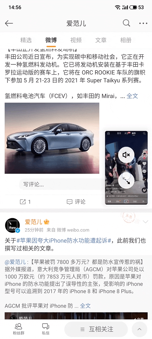 小窗呼出后,通过底部的指示条便可以控制其状态了。轻轻上滑,切换成悬浮小窗;轻轻下滑,切换成全屏。