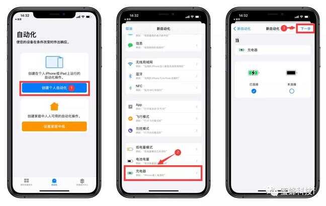 打开快捷指令软件,点击中间的自动化【创建个人自动化】,选择【充电器】,再选择【已连接】,在点击【下一步】
