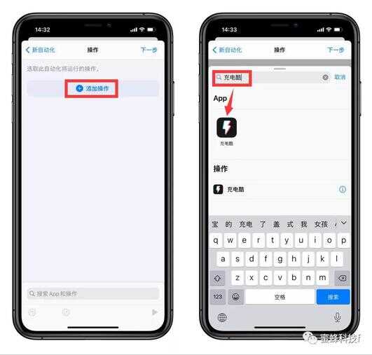 选取【添加操作】,再点击底部搜索【充电酷】进行下一步