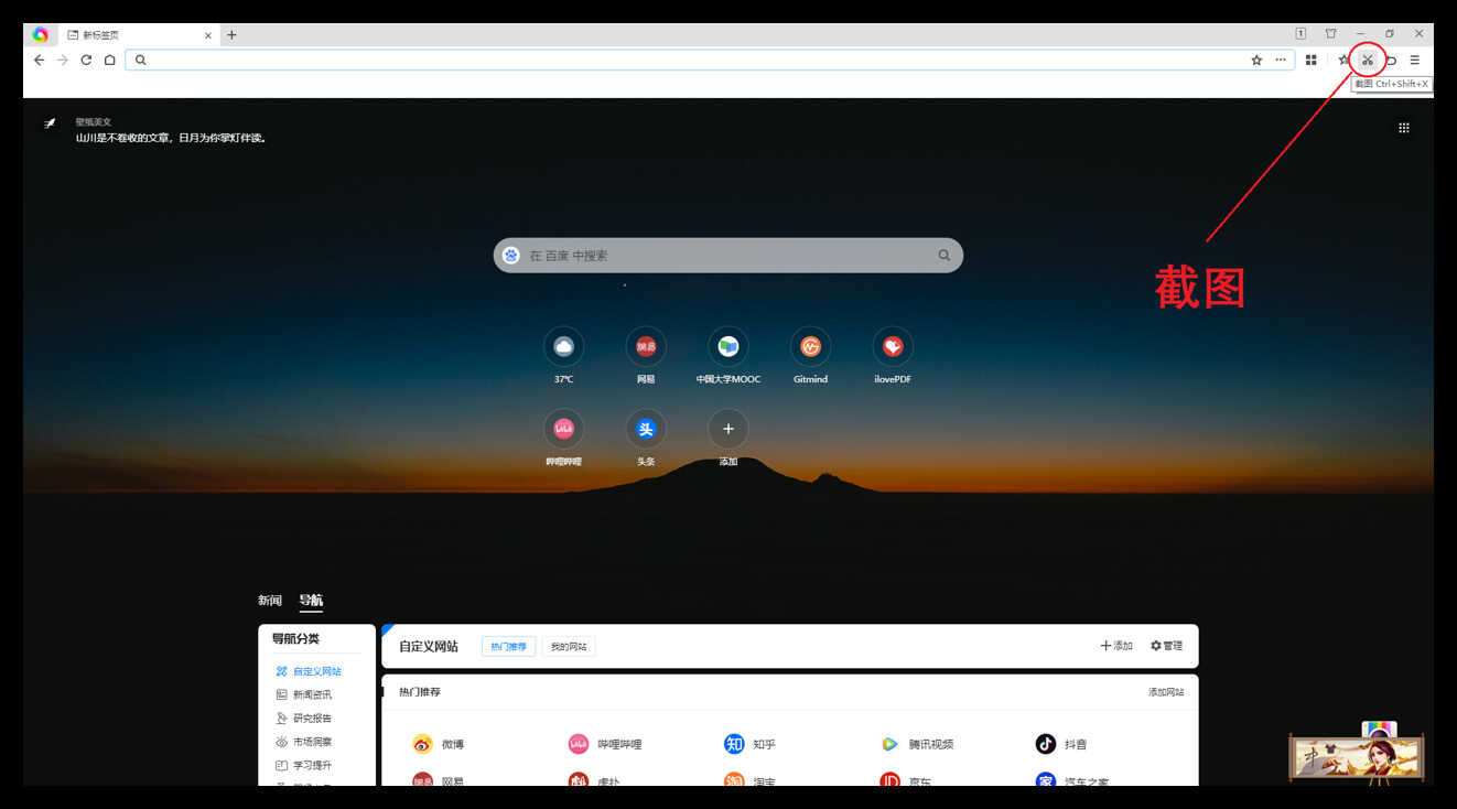 很多的浏览器的顶部,都可以看到有个“剪刀”形状,这就是浏览器自带的截图功能,点击它就可以进行网页截图了。