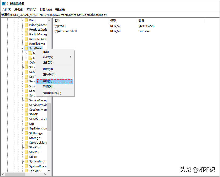 3、HKEY_LOCAL_MACHINE > SYSTEM > CurrentControlSet > Control > SafeBoot。在此项上点击鼠标右键,选择“导出”这一项。