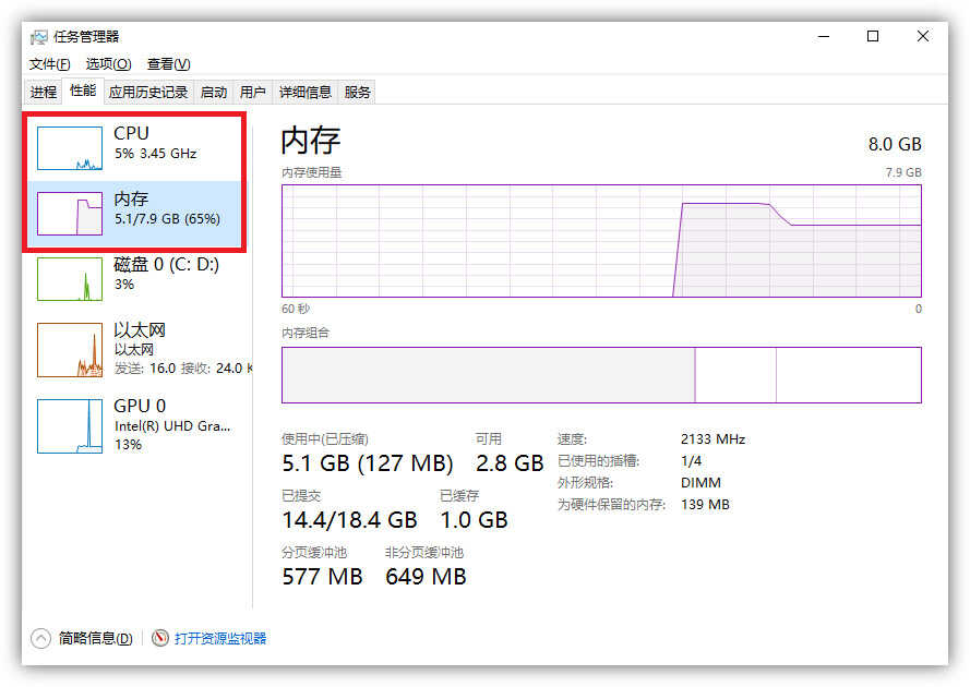 内存、CPU占用过高,就会导致的电脑卡顿,按下快捷键【Ctrl+Alt+Delete】,打开任务管理器,点击【性能】,查看CPU和内存的使用率。