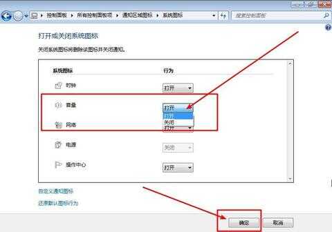 4、 最后,我们找到“音量”,在后面的行为下方选择“打开”,最后点击“确定”