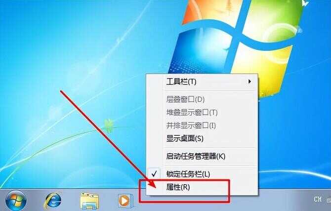 1、 鼠标右击任务栏空白处,在选项中选择“属性”