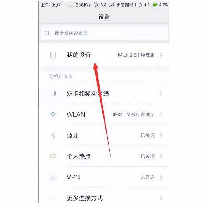 1、 小米手机在桌面找到设置菜单,点击上方的我的设备