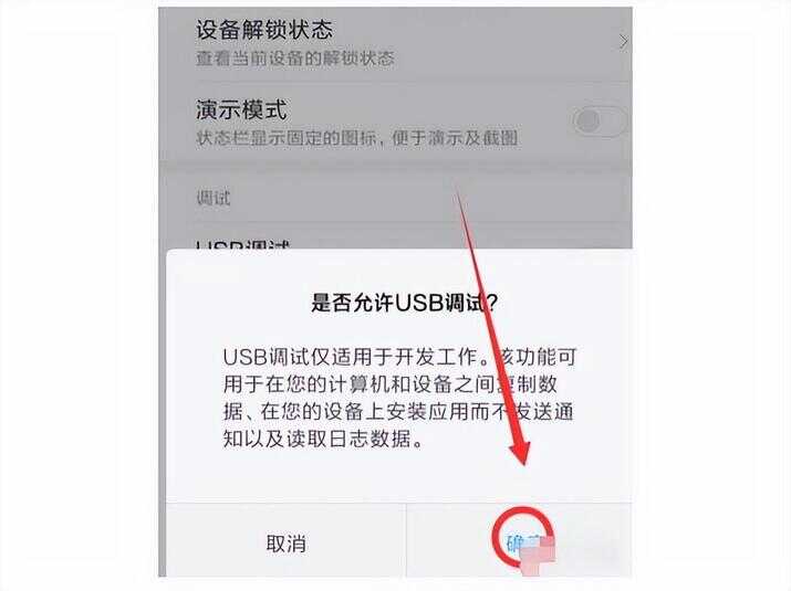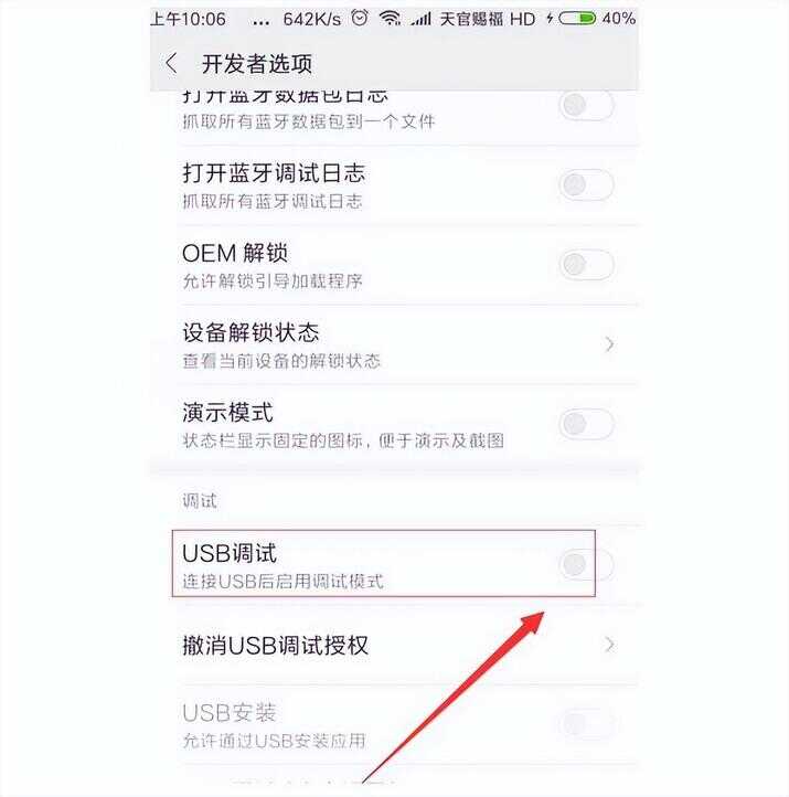 6、 在开发者选项的下边,开启USB调试功能,然后使用数据线连接电脑的时候,弹出来一个菜单点击开启也可以