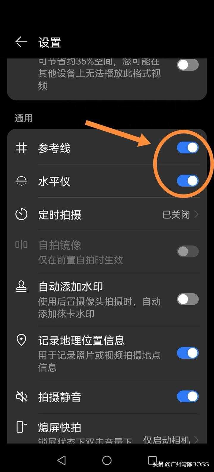 这两个设置一定要提前打开,华为手机的参考线是“九宫格”辅助线,可以让摄影构图更轻松、快速、精准、完美,对摄影初学者而言尤为重要。水平仪也要打开,这样可以使拍摄的照片保持水平而不至于倾斜,减少后期的调整。