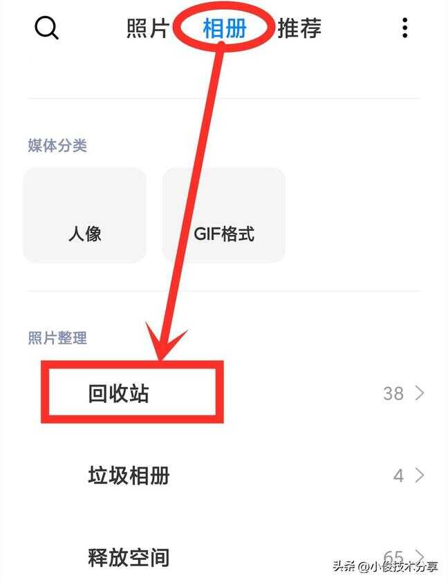 我们打开手机相册之后,直接点击顶部中间的【相册】,然后往下滑动,就可以看到【回收站】了