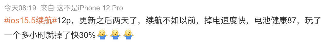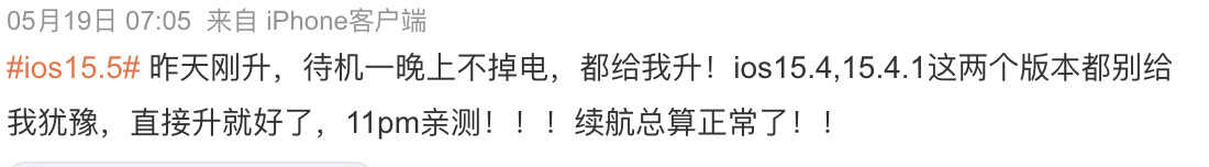 还有iPhone11 pro MAX用户说待机一晚上不掉电续航总算正常了,那么iOS15.5到底值不值得更新呢?我的观点是这一次版本没有带来太多新功能,而从网友们的评价来看是比较两极化的,有说变得更流畅度的,也有说续航变差的。