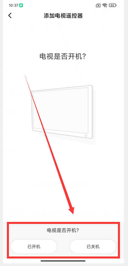 把手机顶部对准电视机(一定要对准哦),然后点击上图的“开关”按钮,这时在屏幕底部会显示“是”与“否”。