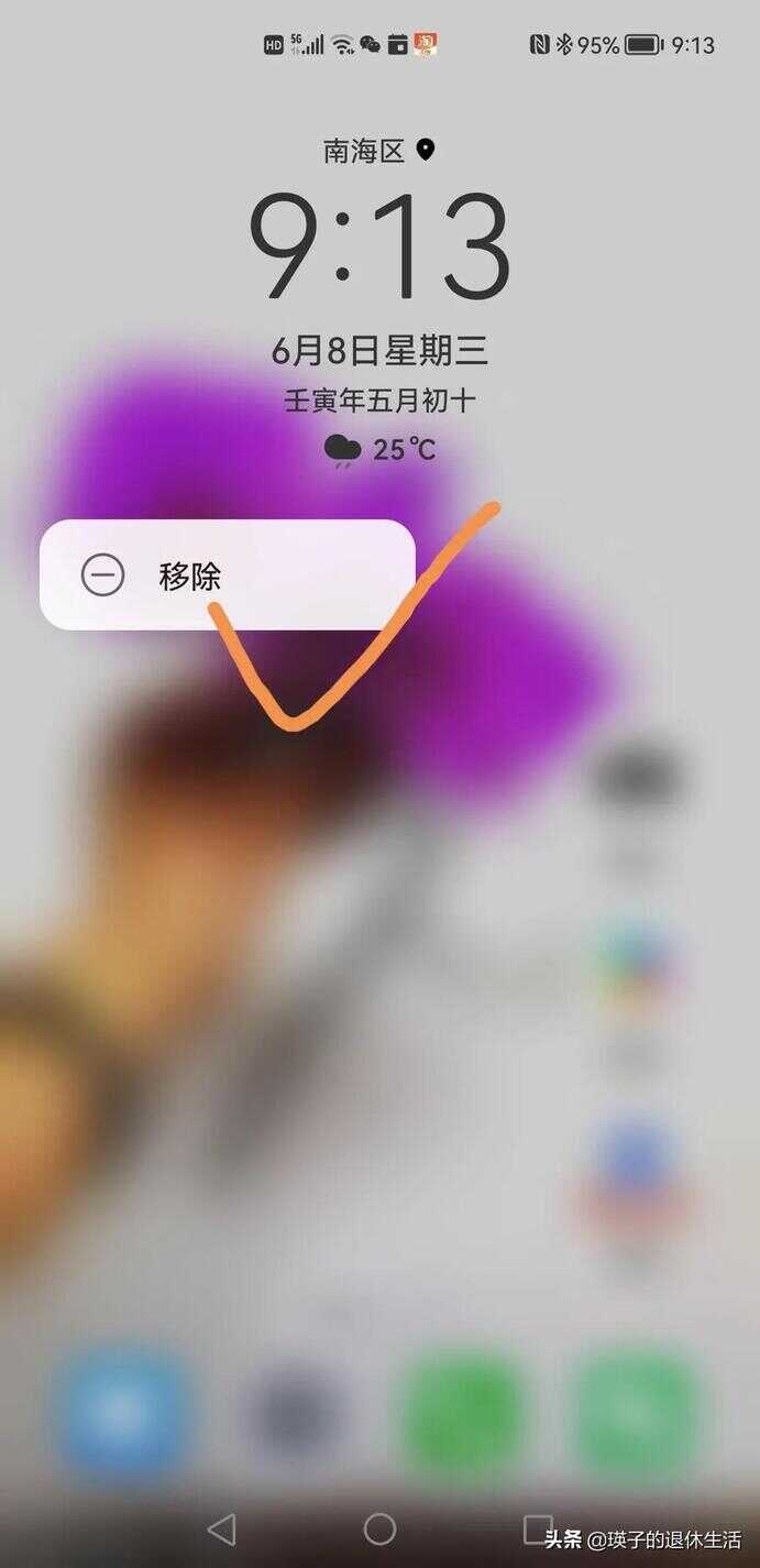 如果你想删除小组件或者更换其他格式,可以用手指长按小组件,然后屏幕会弹出“移除”字样(如下图所示),点击“移除”即可。