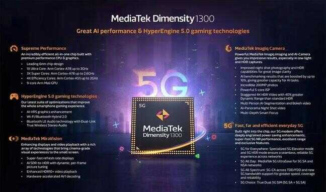 作为对比,联发科的表现就相对优异很多,高端有天玑9000压制骁龙8Gen1,而中端的天玑8100更是堪称一款神U,无论性能还是功耗都比骁龙870更加出色,所以我们最近看到了有多款中端机型搭载了天玑8100,而在售价更便宜的中低端市场,联发科也布局了一款芯片,它叫做天玑1300,接下来我们就可以看到大量采用这款芯片的机型上市,那么,天玑1300到底是一个什么水平呢?