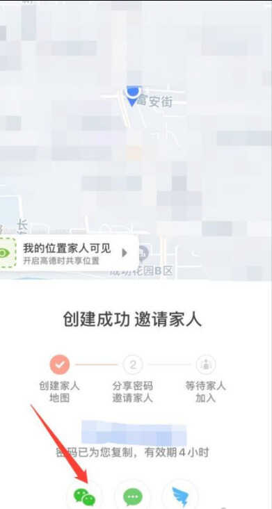 4.点进去后,新弹出的页面,有个【创建我的家人地图】,我们点击一下,这时候,页面会提醒我们:邀请密码已经生成(这个密码的样子大致是:JWUU43YT),并且在这个生成的密码下方有微信、短信或者钉钉等分享按钮图标,这里我们选择微信分享,点一下微信图标,就会进入到微信页面,找到我们时刻关心的那个人的微信,然后在会话框中长按,弹出粘贴提示时,点击粘贴,并点击发送,我们就可以把这个密码发送给对方了。