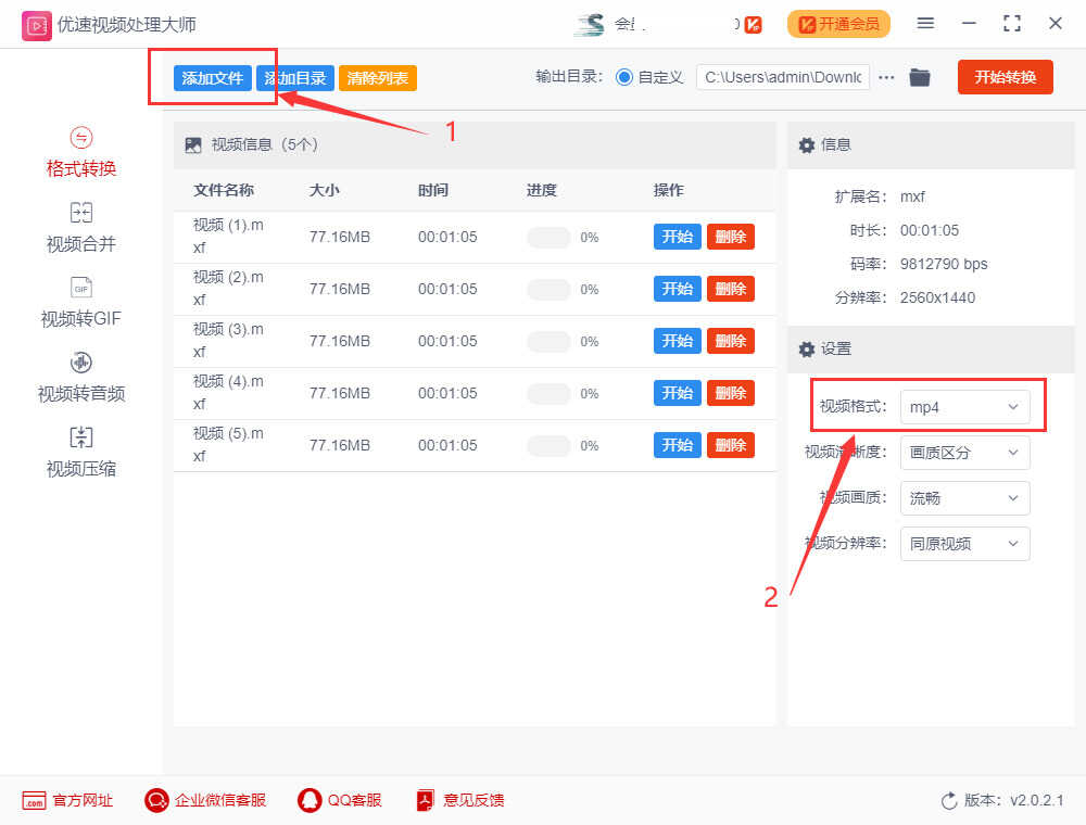 步骤2,点击左上角的【添加文件】按键,将需要转换格式的mxf视频添加到软件中,软件支持批量转换,节约时间。然后在视频格式右边下拉框中选择“mp4”,这样就设置好转换后的视频格式了。