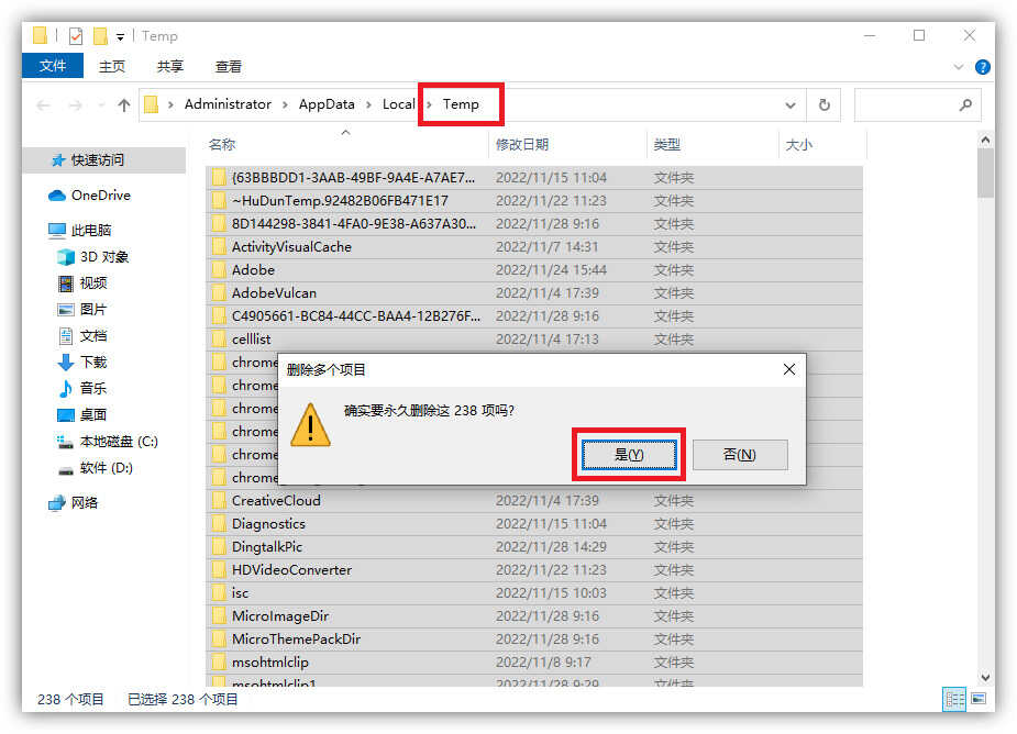 通过这个指令能够直接打开“temp”文件夹,直接按下【Ctrl+A】全选所有临时文件,再按下【Shift+Delete】永久性删除,释放更多的空间。
