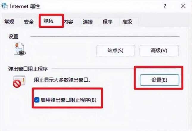 2、选择 隐私 勾选 启动弹出窗口阻止程序 ,点击设置。