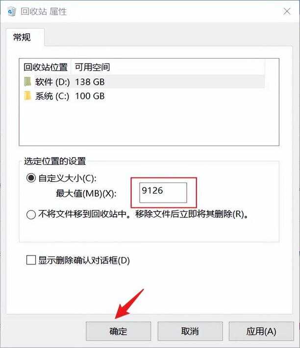 具体操作方法是:鼠标右键单击回收站图标,选择“属性”,在属性设置的“自定义大小”中可以设置回收站的数值,将回收站的空间设置的足够大,比如设置为超过删除大文件的值后,点击“确定”即可。