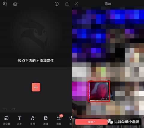 点击界面中的“加号”,我们可以选择添加照片或者视频。选择我们的视频,进行编辑和安排。